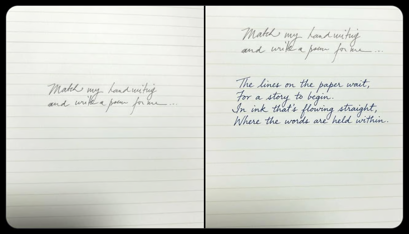 3️⃣ Enter A Style Matching Prompt: Use a prompt like: “Analyze the uploaded handwriting sample and match its style exactly, including letter shapes, spacing, slant, and stroke flow. Write the following text in the same handwriting style: [insert your text].”