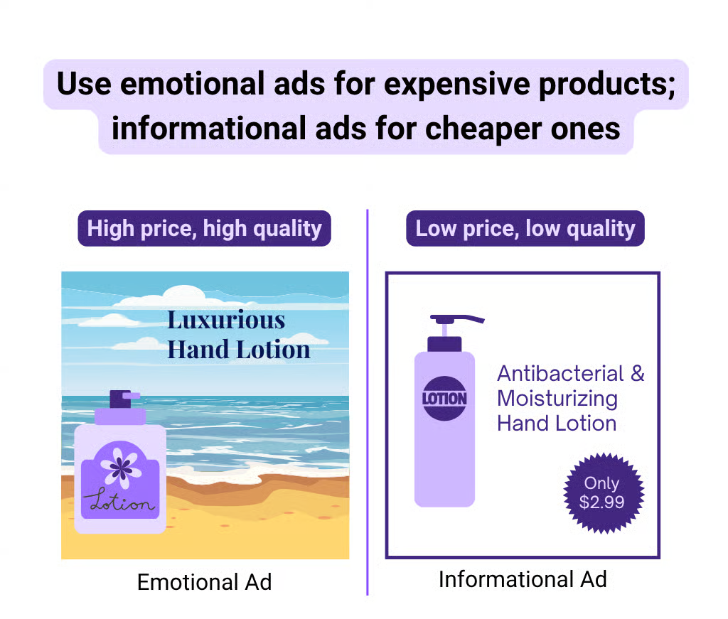 Use informational ads when selling affordable, lower-quality products where trust needs to be built. For expensive, premium products, emotions drive both sales and brand value. Matching the right ad type to the right product ensures both credibility and connection.