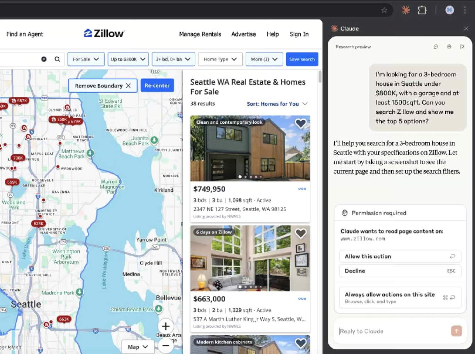 3️⃣ Ask In Plain English: Click the Claude extension icon and type your request naturally. For example, you can ask it to find specific listings, compare options, or summarize results based on your criteria. No special syntax required.