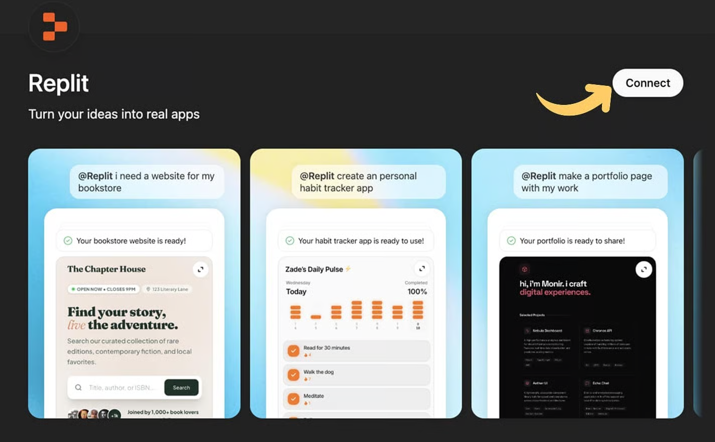 1️⃣ Connect Replit Once: Start by signing up for ChatGPT. Then go to Settings, open Apps and Connectors, select Replit, and connect your account. This is a one-time setup. Once done, Replit becomes available directly inside your chats.