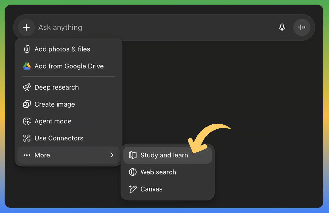 1️⃣ Set up your study mode: Open ChatGPT, select GPT-5, click the + button, then go to More → Study & Learn. Toggle it on to unlock the tutoring feature.