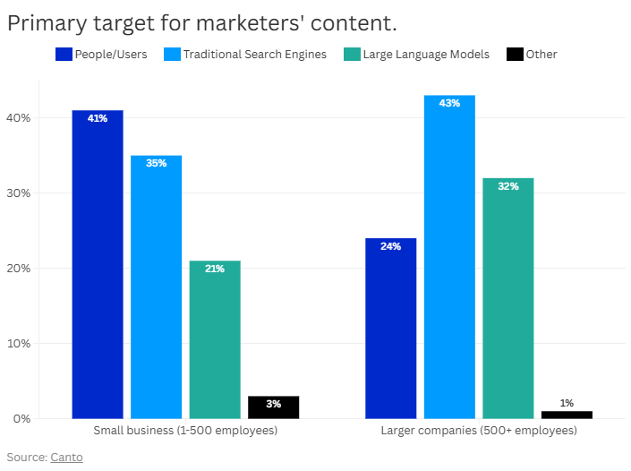 1️⃣ Big Brands Optimize For Algorithms: Larger companies are focusing heavily on search engines and LLMs, with 43% targeting search and 32% writing specifically for AI visibility. Their strategy is built around scale and discoverability.