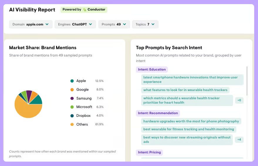 1️⃣ Access The AI Visibility Snapshot Tool: Visit Conductor’s AI Visibility Snapshot report page and enter your company website URL along with your work email address. This connects your domain to their AI tracking system.