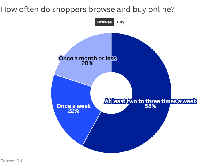 1️⃣ Browsing Is A High Frequency Habit: Fifty-eight percent of shoppers browse products two to three times per week. Another 22 percent browse at least once weekly. That means roughly 80 percent of your audience is actively scanning products every single week.