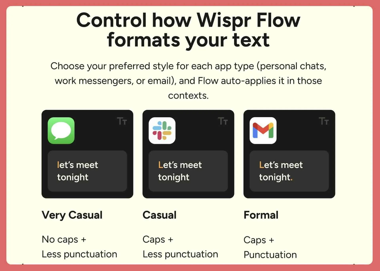 4️⃣ Set It Once, Forget About It: Your chosen style applies everywhere you dictate on the desktop. You do not need to restate tone or rewrite after speaking. The output already fits how you normally write.