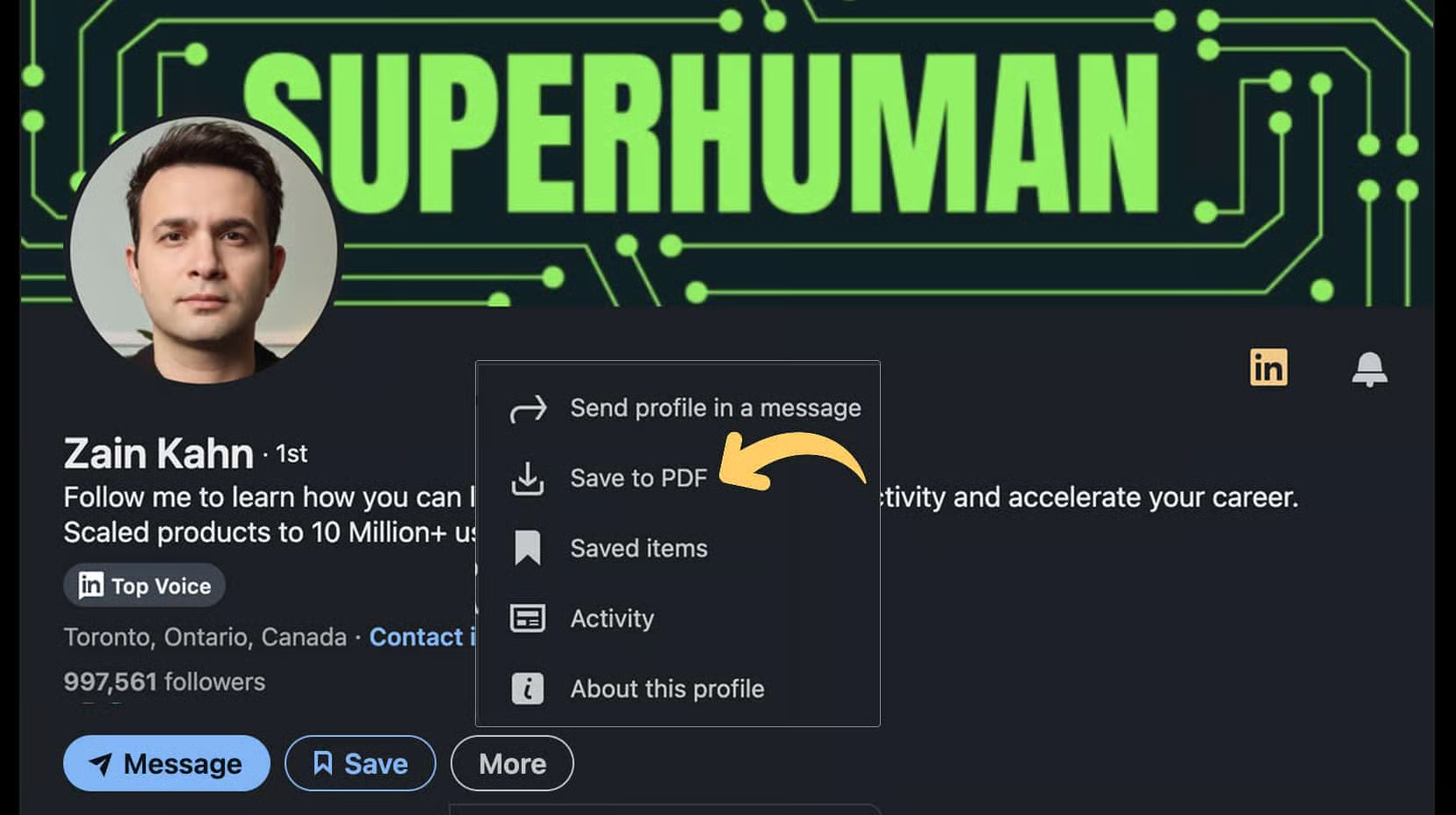 1️⃣ Export Your LinkedIn Profile: Go to your LinkedIn profile → Click More → Select Save to PDF. This gives you a structured version of your current positioning.