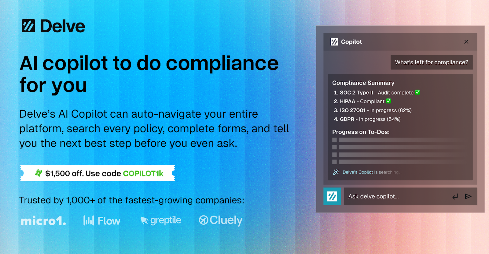 Delve's AI copilot understands your entire tech stack and tells you exactly what to do next. Just ask it "What's my next step? Take me there" and watch Copilot read your screen and start doing tasks for you.