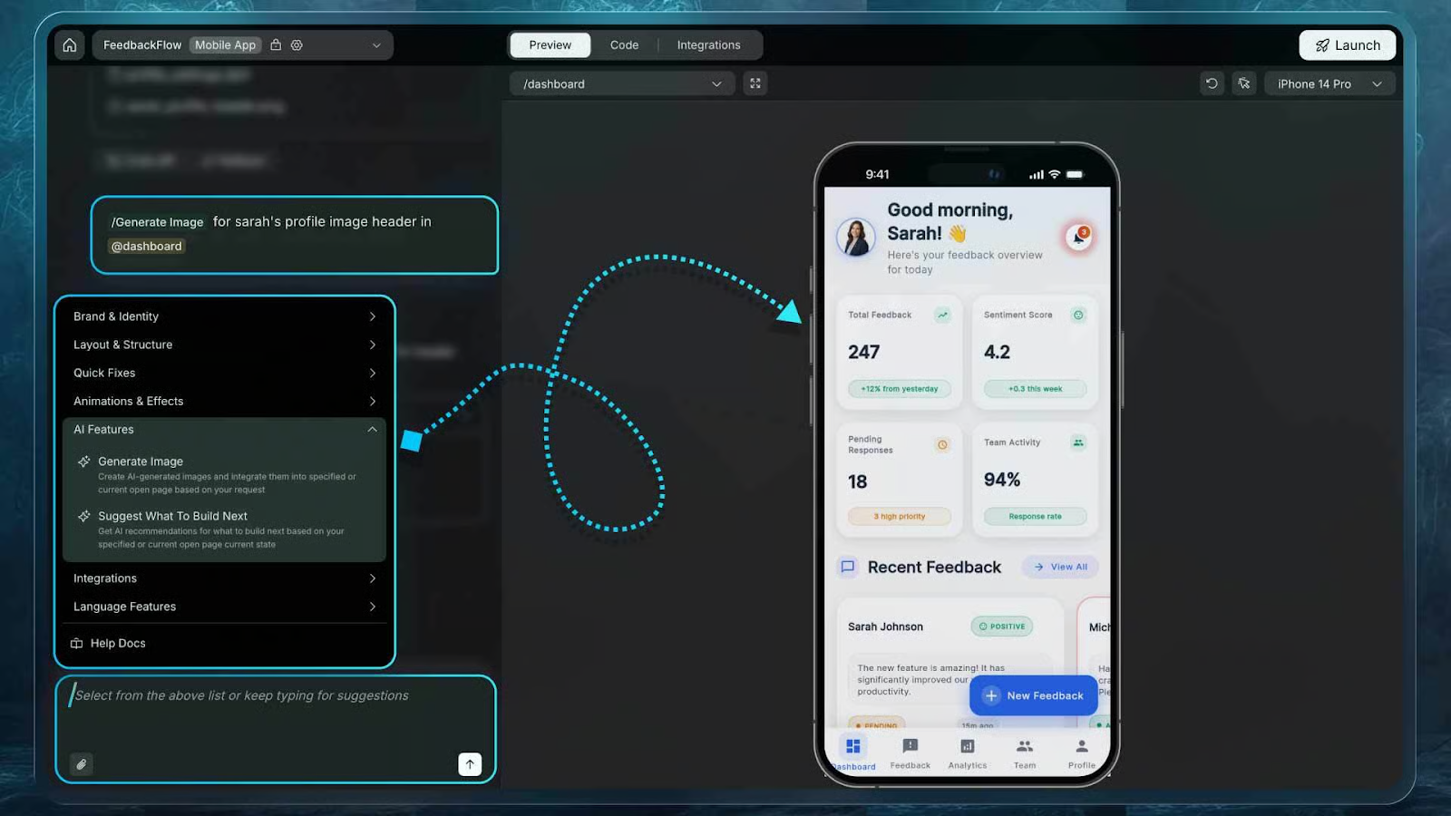 3️⃣ Use Commands to Build Fast: Some of the most useful commands include: • /Update Content to rewrite text • /Add Element to introduce CTAs, buttons, or new blocks • /Add Stripe Payments to set up checkout in your pricing flow • /Generate Image to create visual assets for your screens • /Restructure Layout to redesign the interface instantly These commands handle the heavy lifting behind the scenes so you can focus on flow and function.