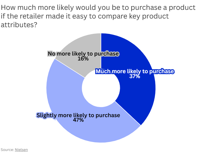1️⃣ Comparison Drives Conversions: A combined 84% of shoppers are more likely to purchase when retailers make it easy to compare key product attributes. Clarity reduces hesitation.