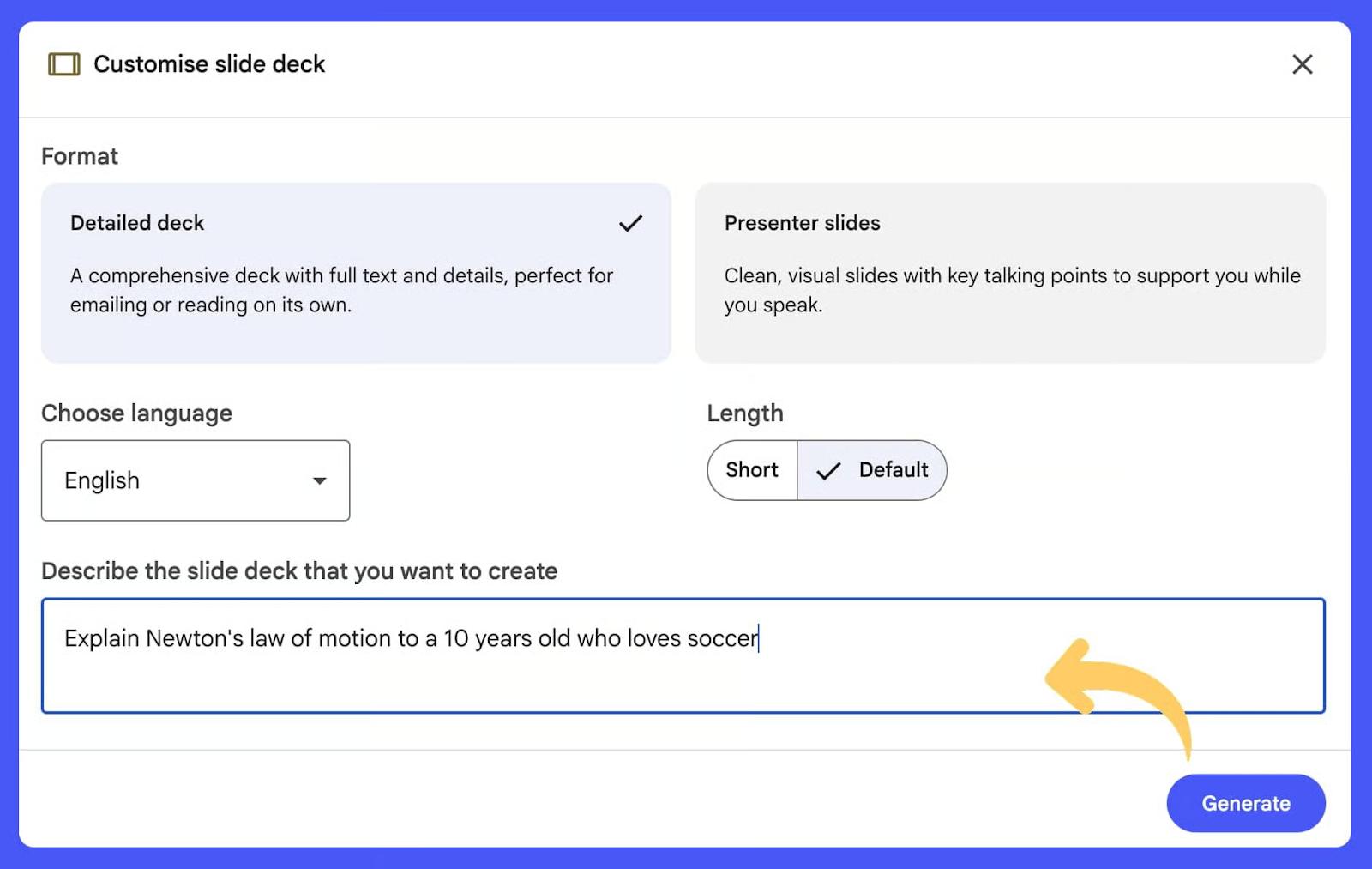 3️⃣ Generate a Slide Deck With a Prompt: Go to the Slide Deck, describe what you want, then hit Generate. Sample Prompt: “Explain Newton’s law of motion to a 10-year-old who loves soccer.”