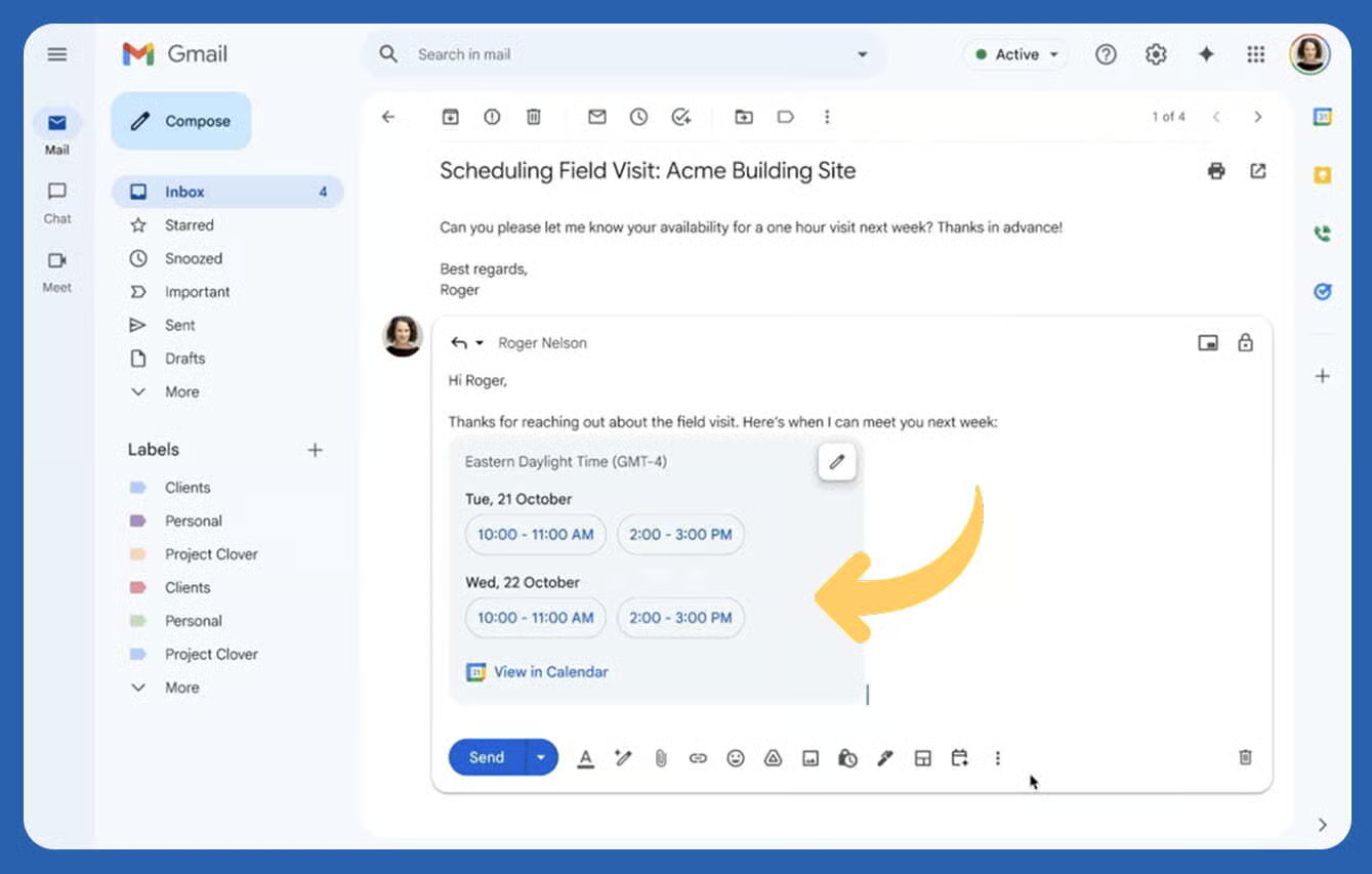 Gmail now makes scheduling meetings effortless by combining your inbox context with real-time calendar availability. With Gemini built directly into Gmail, you can propose meeting times in seconds without switching tabs or checking dates manually.