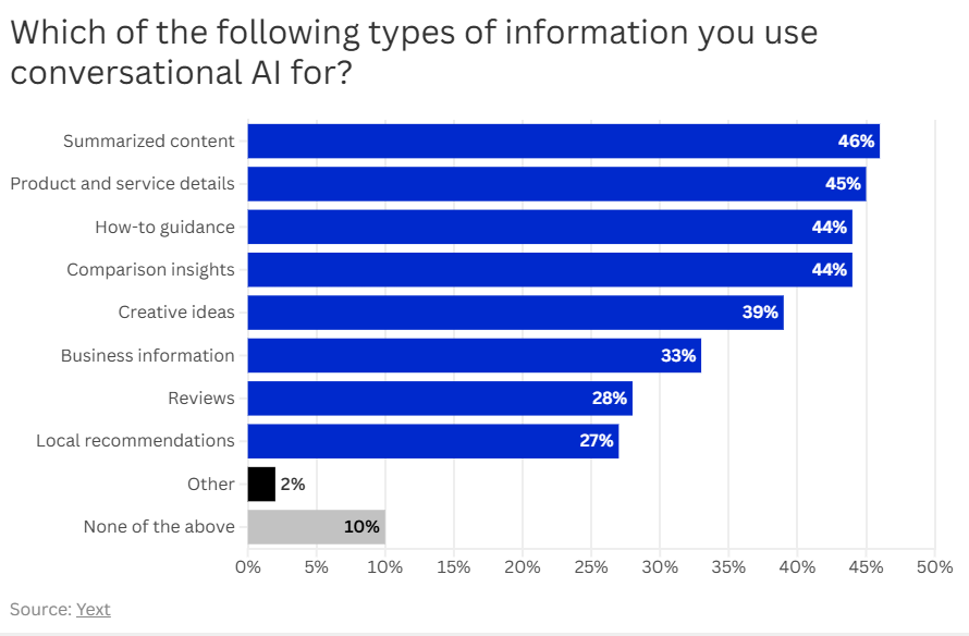 1️⃣ Efficiency Is The Primary Driver: The top use case for conversational AI is summarised content, with nearly half of users relying on it to cut through information overload. People want the core insight without the friction of scrolling.