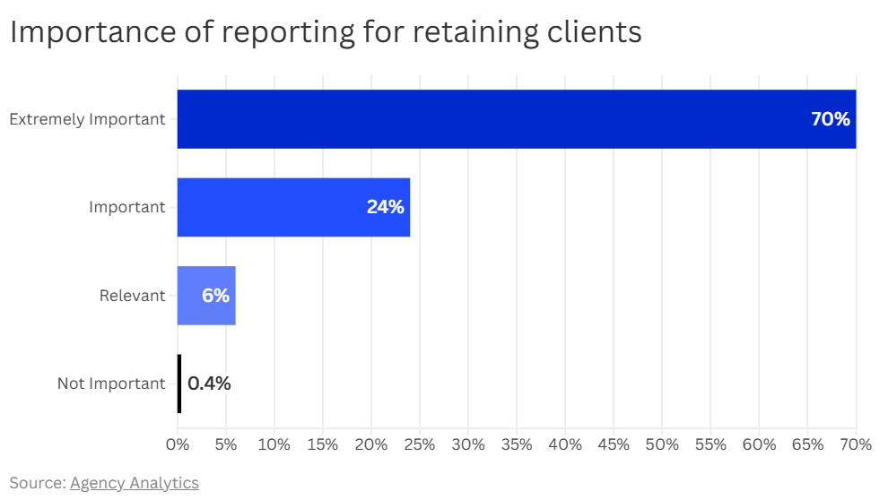 1️⃣ Why Skipping Reports Is Risky: Nearly seventy percent of agencies rate reporting as extremely important for client retention, with another twenty four percent calling it important. An almost negligible fraction believe it does not matter. When clients do not see regular updates, they assume work has slowed or stopped. Perception fills the gaps left by silence, and it is rarely generous.