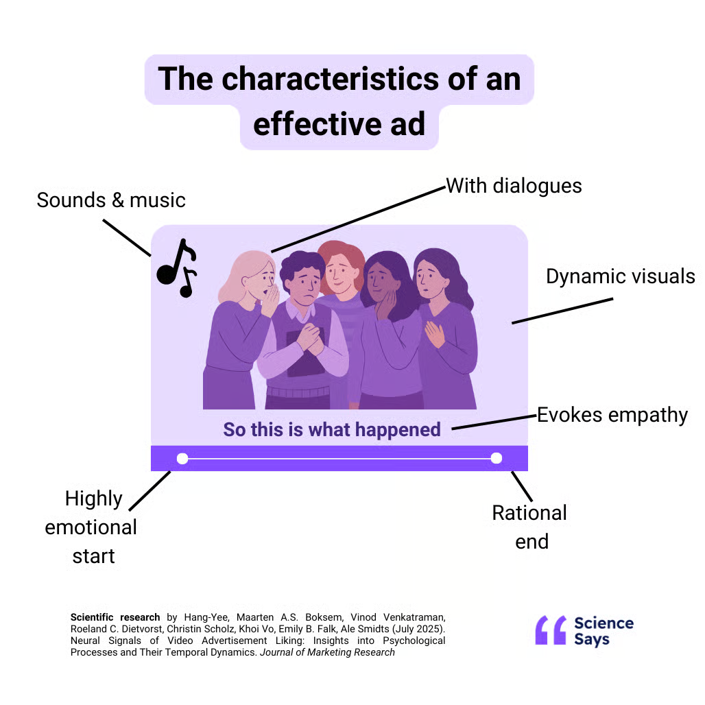 🎓 What The Research Found: In a study involving 113 participants in the US and the Netherlands, researchers used fMRI scans to measure subconscious reactions to video ads. Ads that performed best shared common traits. They opened with emotionally charged scenes, introduced logic toward the end, used dialogue with both voice and on-screen text, and combined visual motion with sound. The first ten seconds were especially predictive of success. Ads that encouraged people to evaluate whether the product fit their needs performed better, while ads overloaded with numbers or calculations reduced liking.