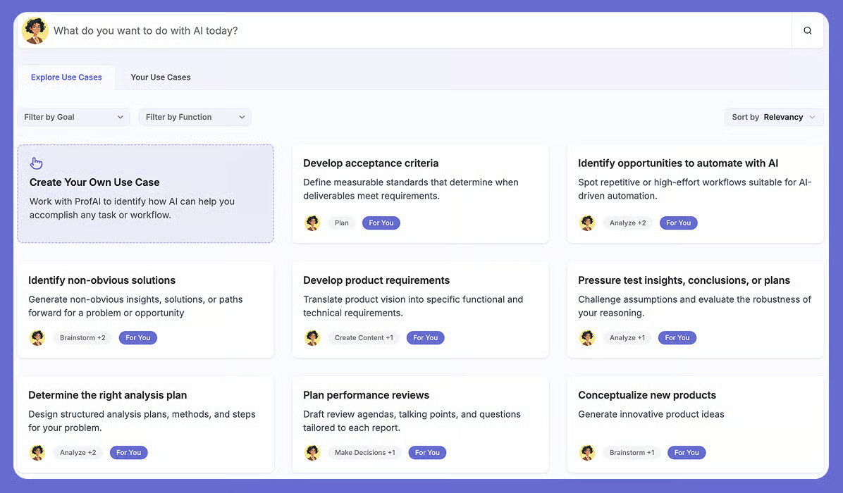 2️⃣ Explore The Use Cases Library: Open the Use Cases tab to view suggested applications tailored to your role. You can select a recommended use case or create a custom one from scratch if your needs are more specific.