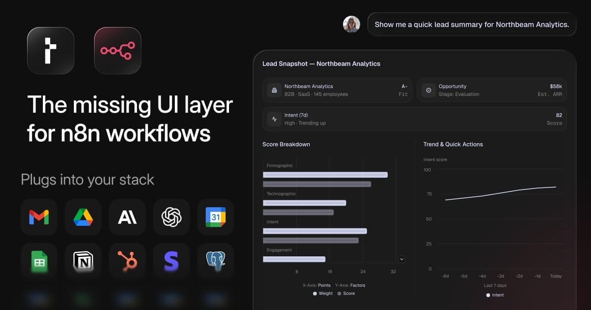 Turn your n8n workflows into intelligent AI apps in minutes.