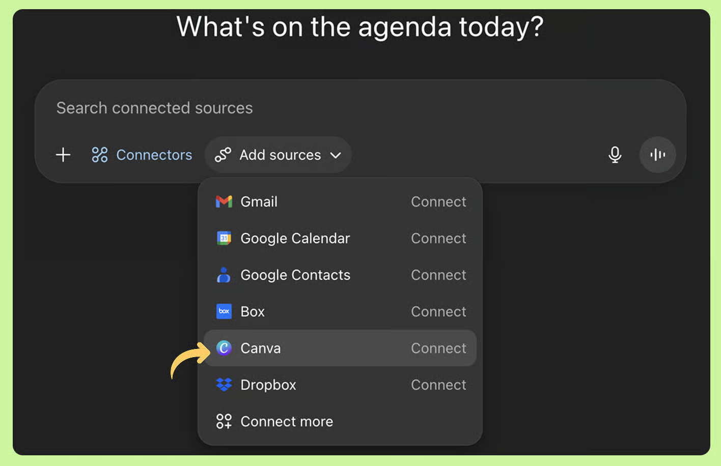 2️⃣ Connect Canva to ChatGPT: In ChatGPT, click the + button, go to Connectors, and link your Canva account.
