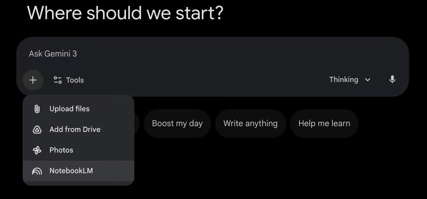 2️⃣ Open Gemini And Add The Notebook: Inside the Gemini chat interface, click the plus icon. Select NotebookLM and choose the notebook you want Gemini to reference. This connects your curated database to the conversation.