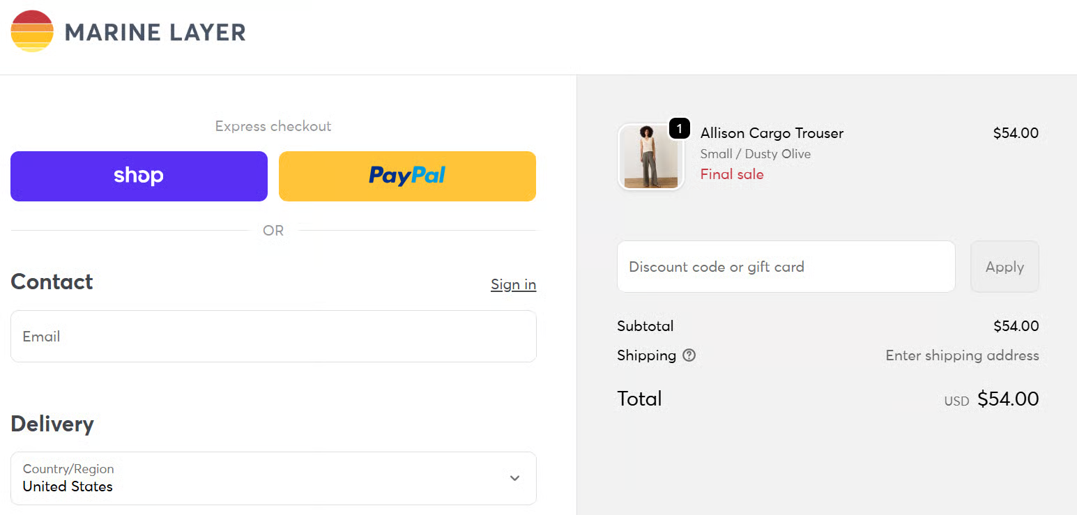 👀 Real Life Example: Marine Layer currently asks for email only at checkout. A stronger approach would be prompting visitors to register or log in before browsing, then following up with product recommendations or cart reminders if they leave. Additional improvements like contextual product imagery, FAQs, and smart retargeting could further lift conversions.
