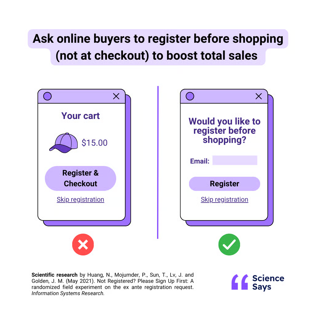 🎓 What The Data Shows: In a field experiment with seventy five thousand users on a photo collage ecommerce site, customers asked to register at the start of browsing behaved very differently. They were fifty-eight percent more likely to register, nearly eleven percent more likely to make a purchase, bought almost seventeen percent more items, and generated over thirteen percent higher total revenue across a year. While casual browsers were slightly more likely to drop off early, total purchases did not decline.