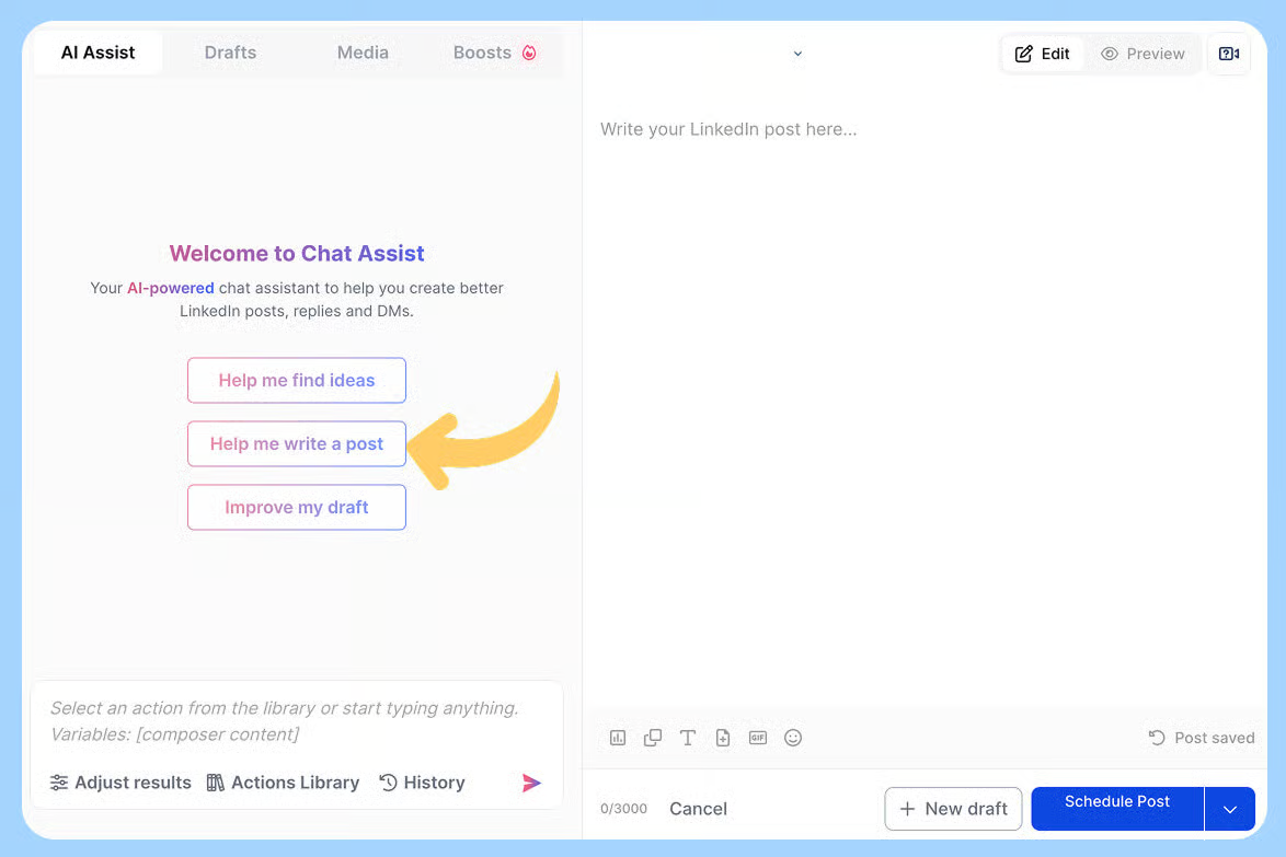 4️⃣ Draft And Refine The Post: Ask AI Assist to expand the outline into a full draft. Then edit it to sound unmistakably like you. Clarity, honesty, and specificity matter more than polish.