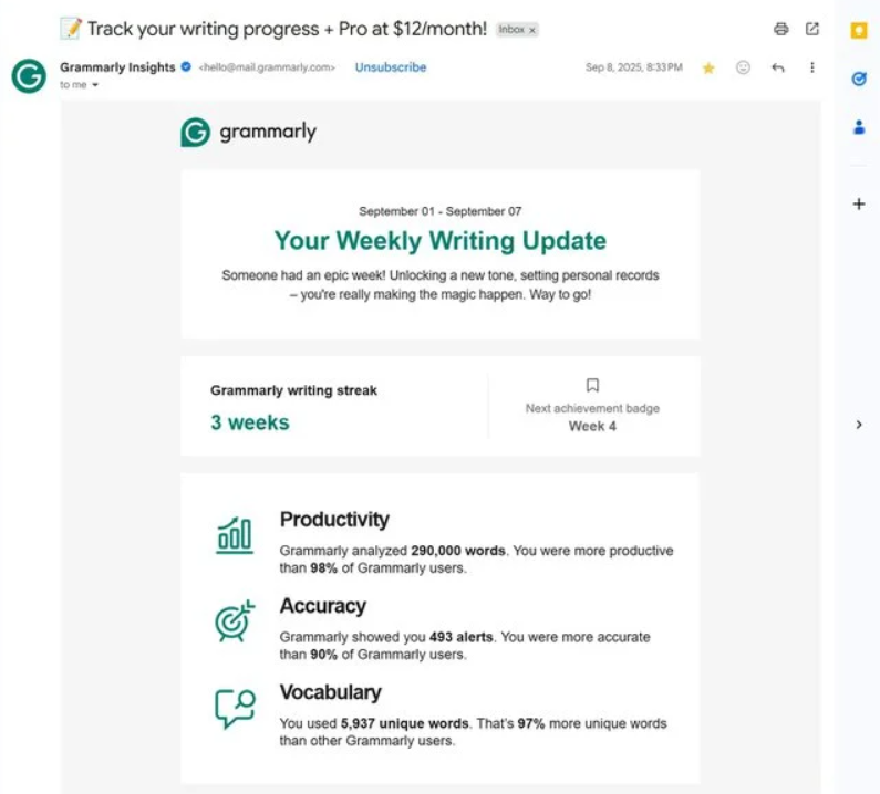 5️⃣ Show What They Would Lose: Instead of highlighting features, highlight usage. Grammarly does this in renewal emails by showing how many words were checked and errors corrected, making cancellation feel like losing accumulated value.
