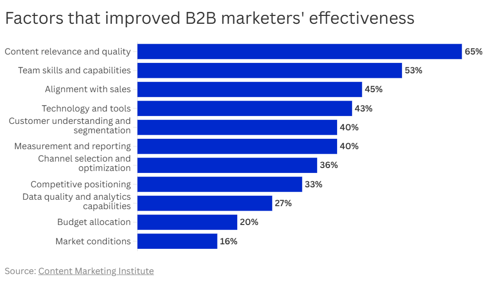1️⃣ Relevance And Quality Win First: Around 65% of marketers say content performance improves when it is more relevant and higher quality. This means creating the right content for the right audience at the right stage of the buying journey.