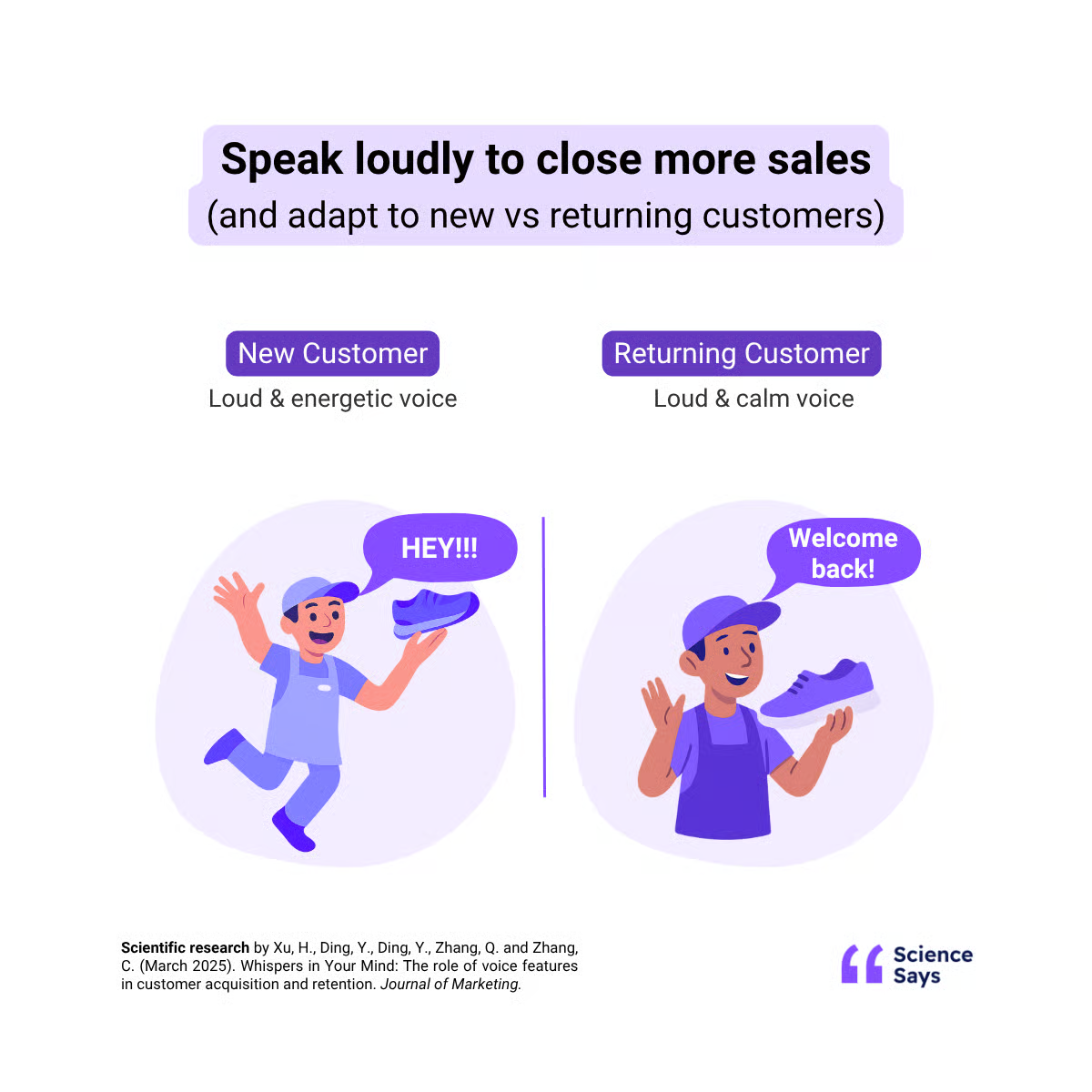 1️⃣ Use Loud, Confident Tones for Everyone: Across the board, a louder, more powerful tone increases buying likelihood. It signals confidence, certainty, and presence. Customers perceive loud voices as more competent, which nudges them toward taking action faster.