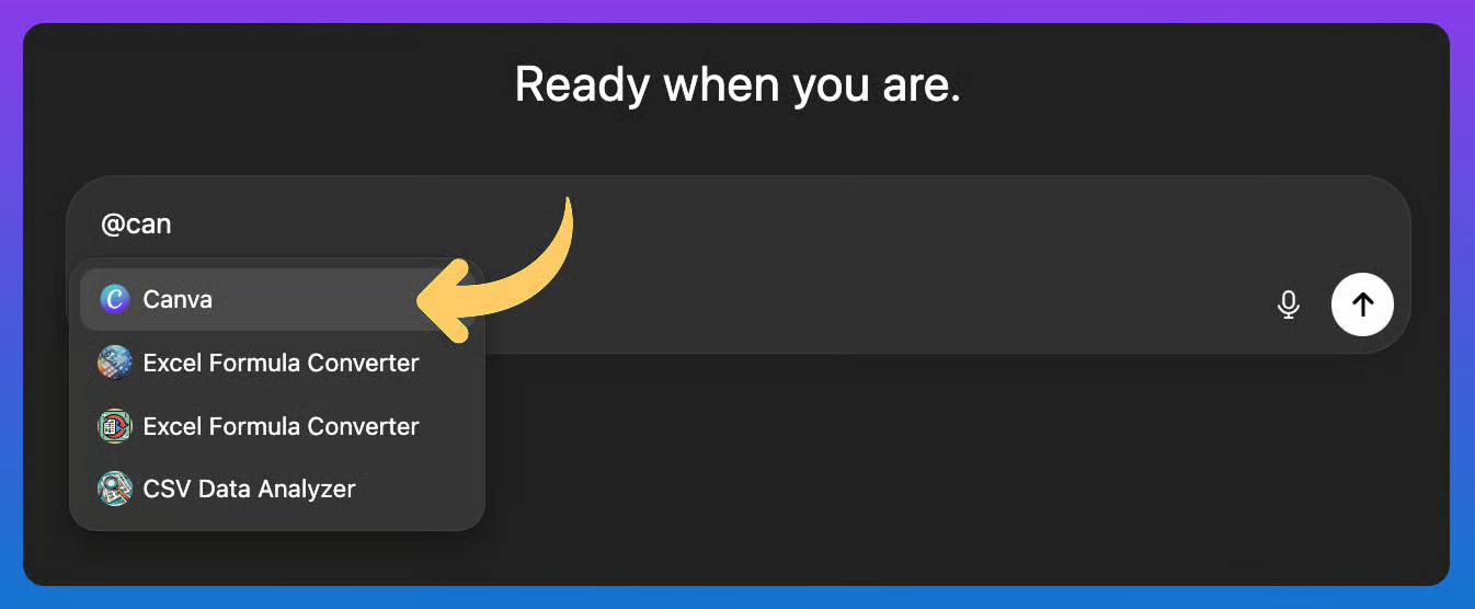 1ļøā£ Activate the Canva Plugin: Head to ChatGPT, type ā@canva,ā and select the plugin. This integration allows you to design directly inside ChatGPT. You can start with your own idea or upload a document to build visuals from your existing content.
