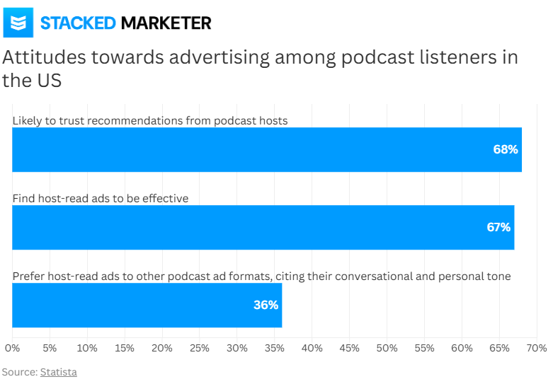 1️⃣ Trust Is the Key Metric: Podcast listeners show remarkable confidence in host recommendations. Research highlights that 68% of listeners trust these endorsements, while 67% say host-read ads are effective in influencing their choices.