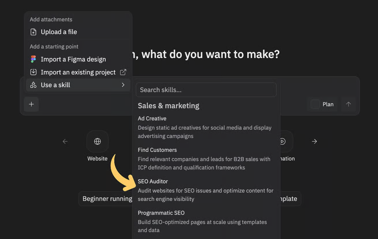3️⃣ Access The SEO Auditor Tool: Click the “+” button in the input box and select the SEO Auditor skill. This activates the audit feature. It is built to quickly scan and evaluate your website performance.
