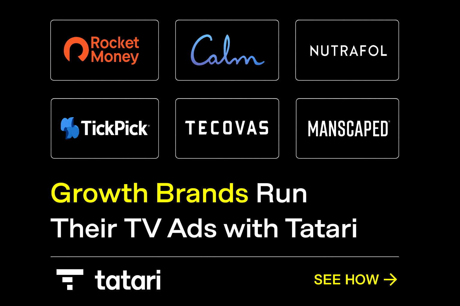 Over 300 brands like Jones Road Beauty, Tecovas, Ridge Wallet, and Calm already advertise on TV with Tatari.
