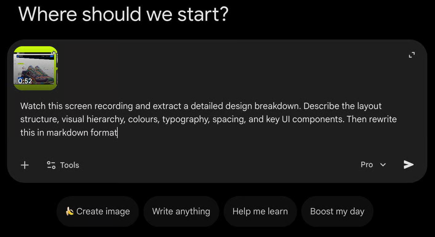 2️⃣ Upload The Recording To Gemini 3 Pro: Upload the screen capture to Gemini 3 Pro and ask it to extract a detailed design breakdown. The prompt should request layout structure, visual hierarchy, colors, typography, spacing, and key UI components, and ask for the output to be rewritten in markdown format for easy reuse.