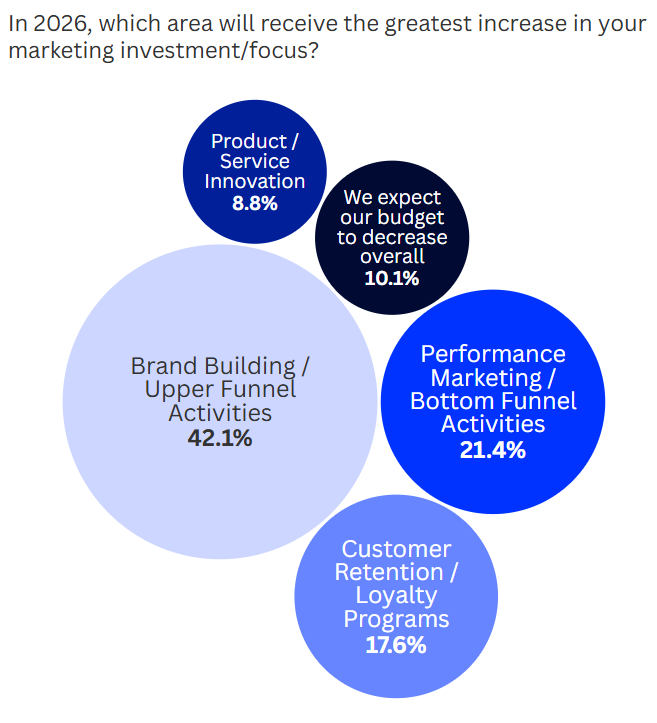 A significant share of marketers are now reallocating spend toward brand and upper funnel activity in 2026. The numbers tell a clear story. Over forty percent plan to increase investment in brand building.